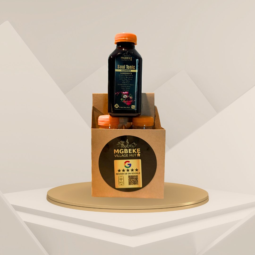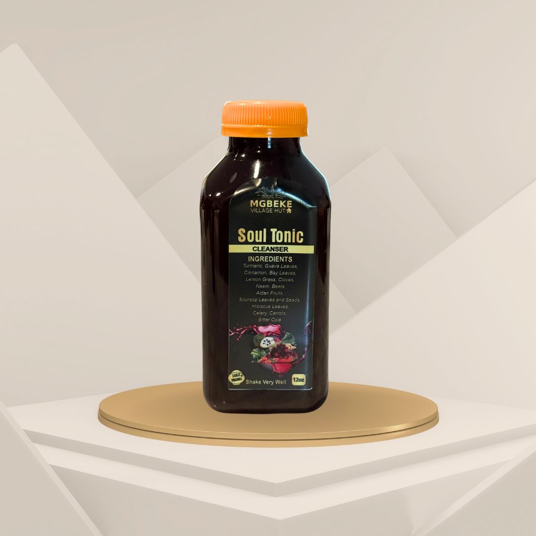 MVH Signature Soul Tonic: THIS IS NOT ZOBO, PLEASE! It’s freshly juiced and made with turmeric root, guava leaves, Cinnamon, bay leaves, cloves, lemon grass, neem leaves, beet, prekese Aidan fruit, soursop leaves, tangerine leaves, ginger roots, alligator peppers, bitter cola, lemon juice and zest, carrot, celery, hibiscus, cayenne pepper, and other healthy spices and dates. No sugar added. It’s sweetened with dates. No Additives. This signature drink is good for the immune system, gut | and digestive health.
